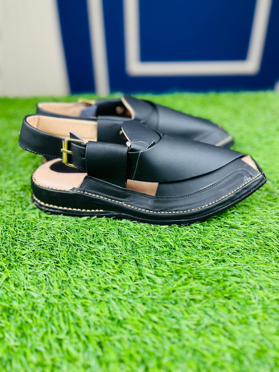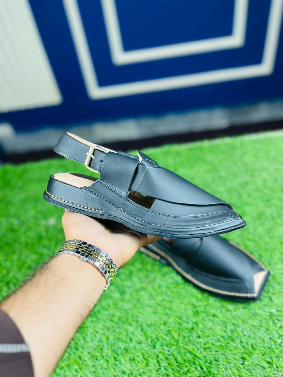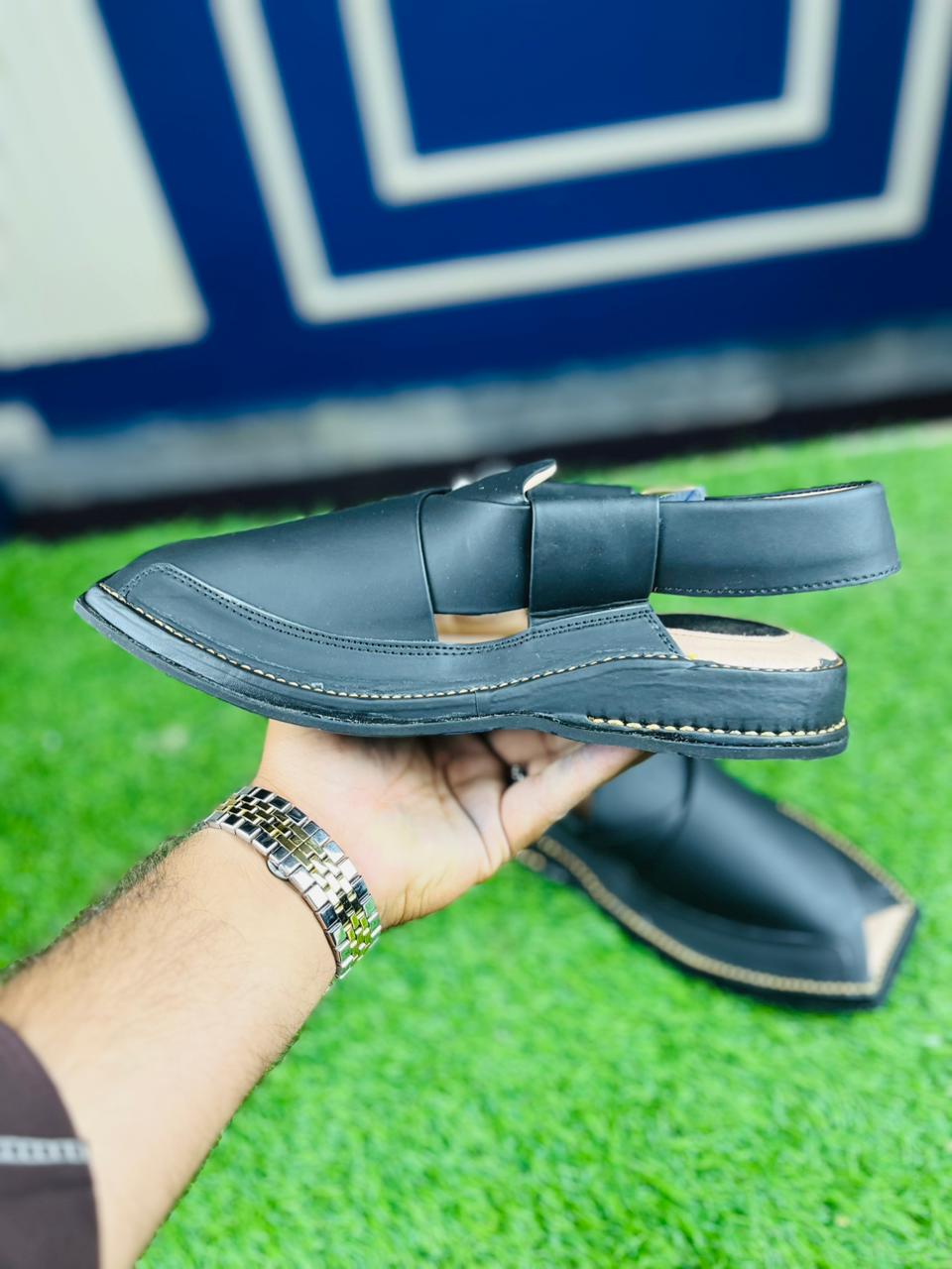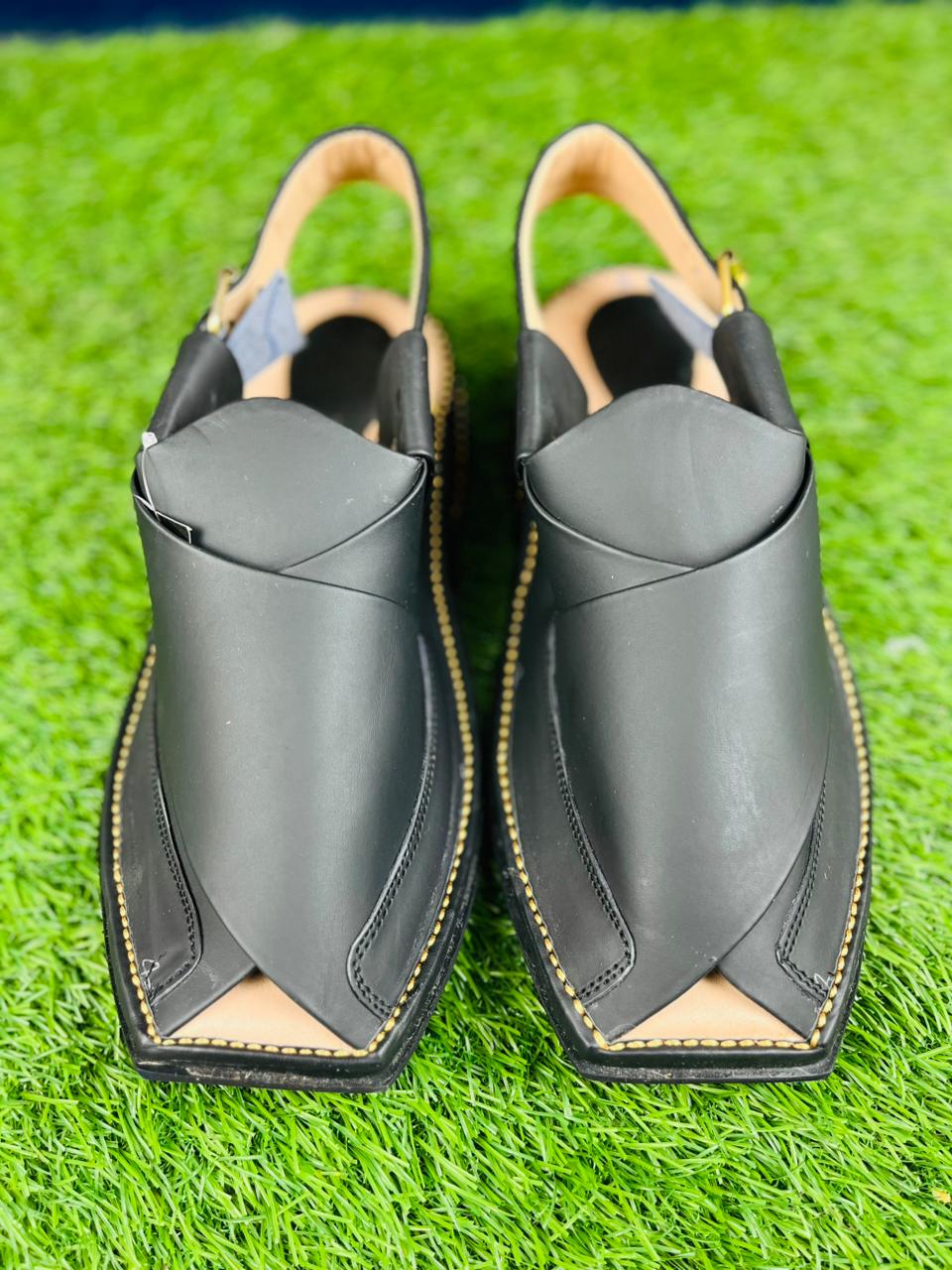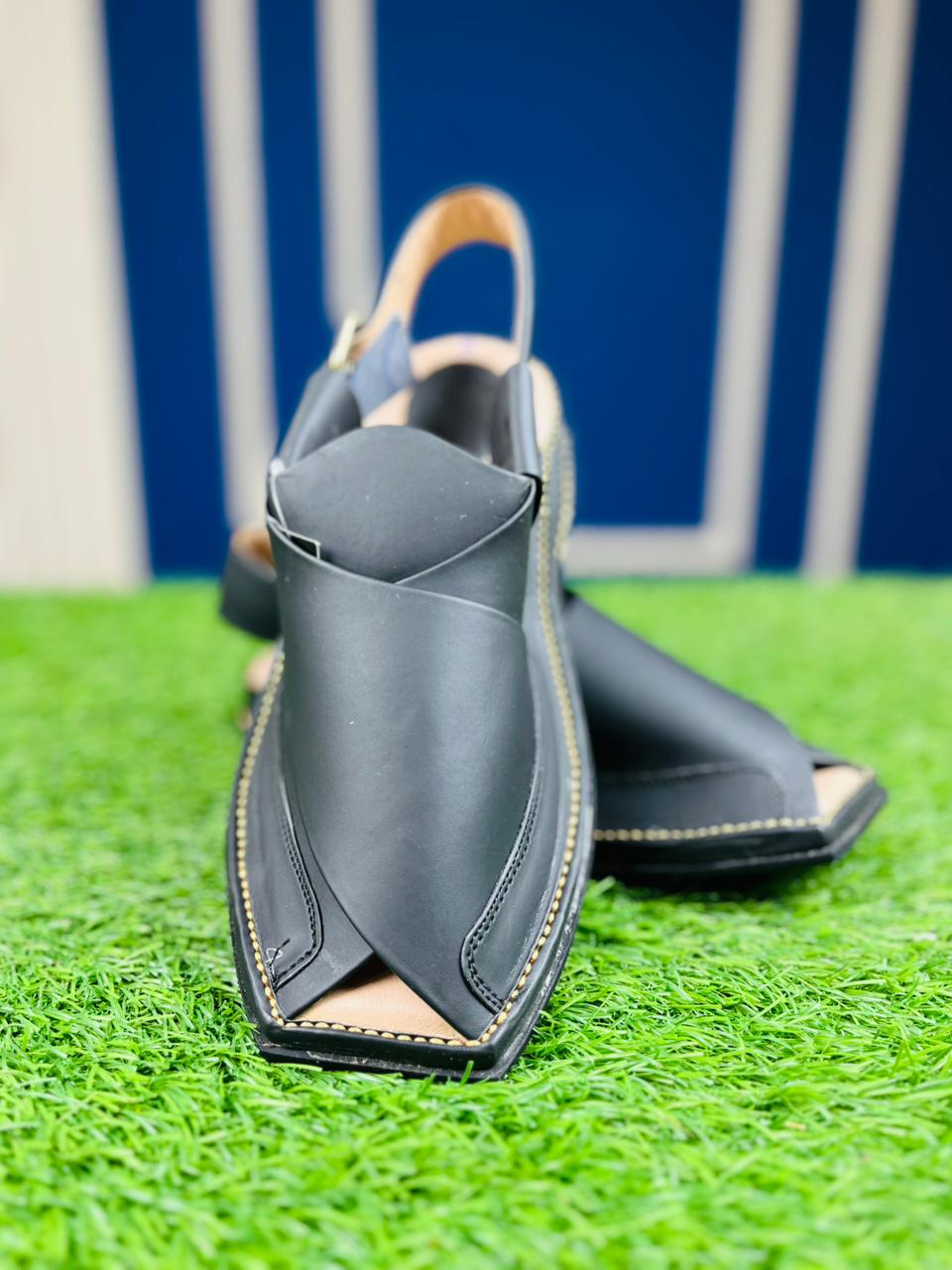 Command attention this Eid with our Signature Black Norozi Chappal. This pair is the ultimate expression of traditional style combined with a bold, modern edge. Expertly crafted with premium matte black leather and detailed contrast stitching, it offers a sophisticated look that pairs perfectly with black, white, or any dark-toned Shalwar Kameez.